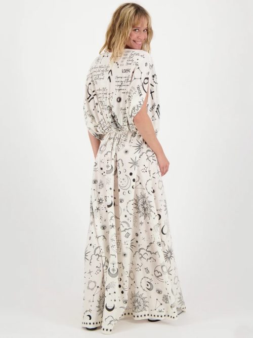 427,00 €El precio original era: 427,00 €.298,00 €El precio actual es: 298,00 €.Un casual corte tipo kaftán de aire bohemio y un suave estampado zodiacal de efecto ilustración: Rose es un diseño tranquilo, elegante, confortable y muy fresco, elaborado en 100% tejido natural. Una prenda estilosa con el sello arty Me369. -