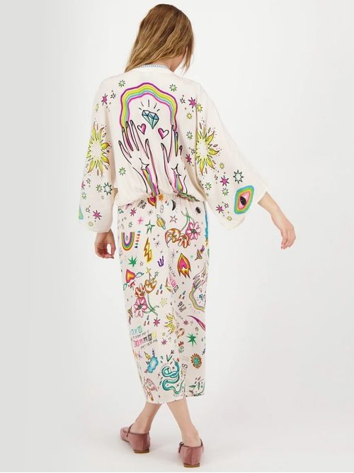 248,00 €El precio original era: 248,00 €.173,00 €El precio actual es: 173,00 €.Nubes multicolor, corazones, serpientes, manos y arcoíris : Enlightment . La firma holandesa Me369 estampa su pasión y creatividad sobre Bailey, un pantalón en vaporoso tejido 100% natural y cintura elástica para una confortable época estival con un toque boho chic. -