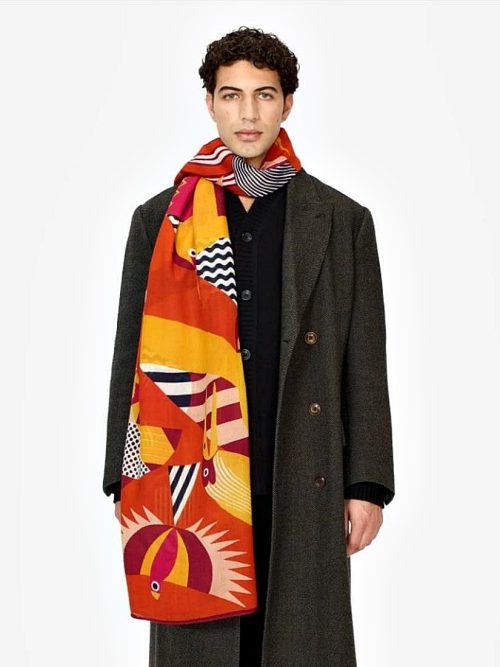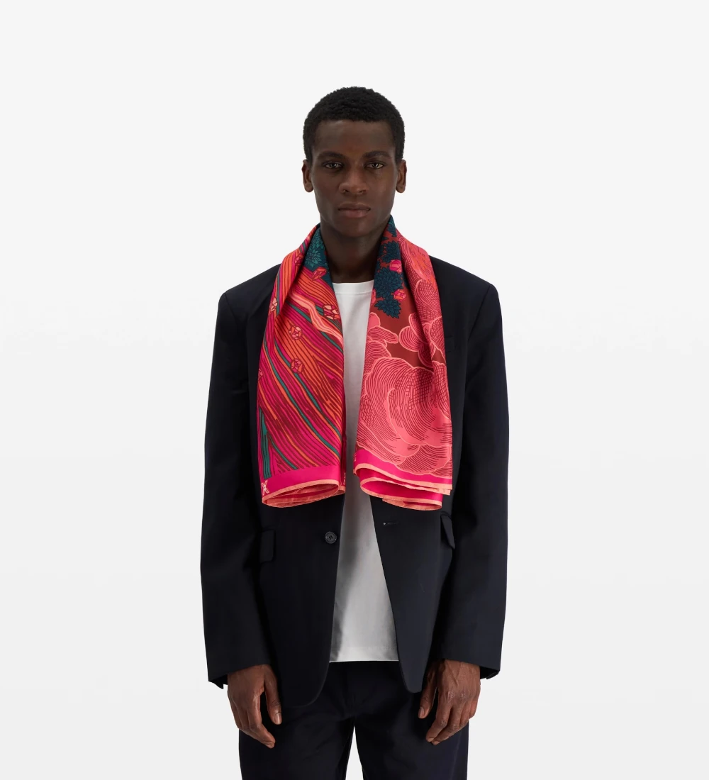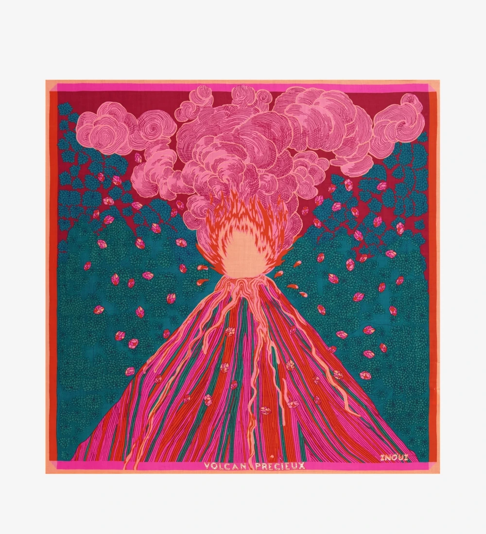 Nubes ardientes, corazones de fuego y corrientes de lava en contraste están enmarcados por fértiles montañas sobre un exquisito lienzo de 100% cashmere.