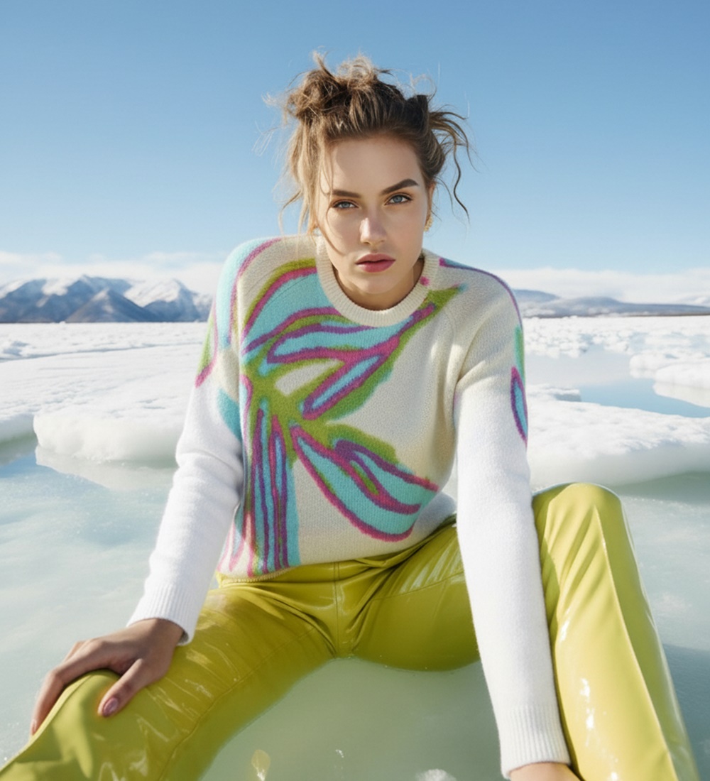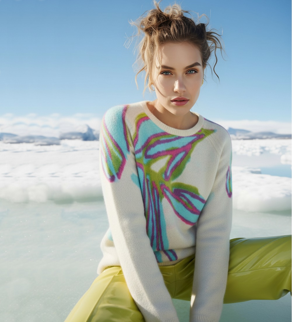 Del hielo ártico a la franja tropical, Esthème fusiona en un shock colorido elementos exóticos y blanco polar sobre una dulce y natural base en 100% cashmere.