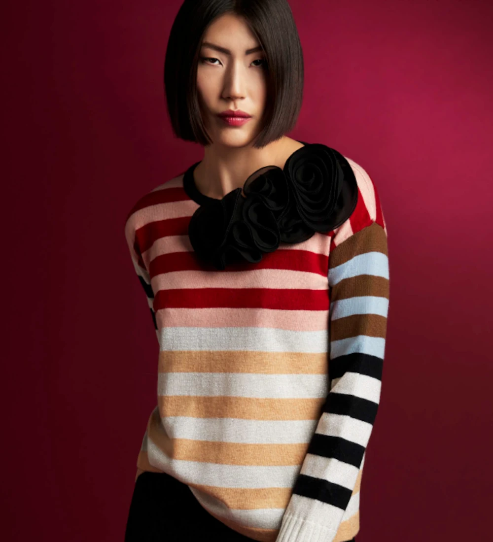 Etiquetas: broche flor, Circus, moda italiana, ropa de marca, suéter, suéter colores, suéter flor, suéter lana, suéter oversize, suéter rayas, tendencias de moda, tendencias mujer, Zoe